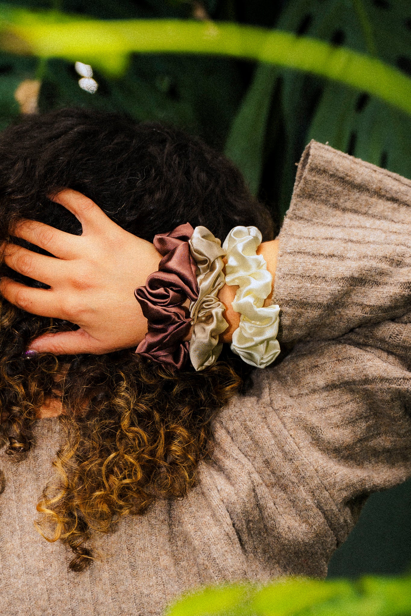 Maintenez vos coiffures intactes toute la journée avec notre trio de chouchous en soie.
