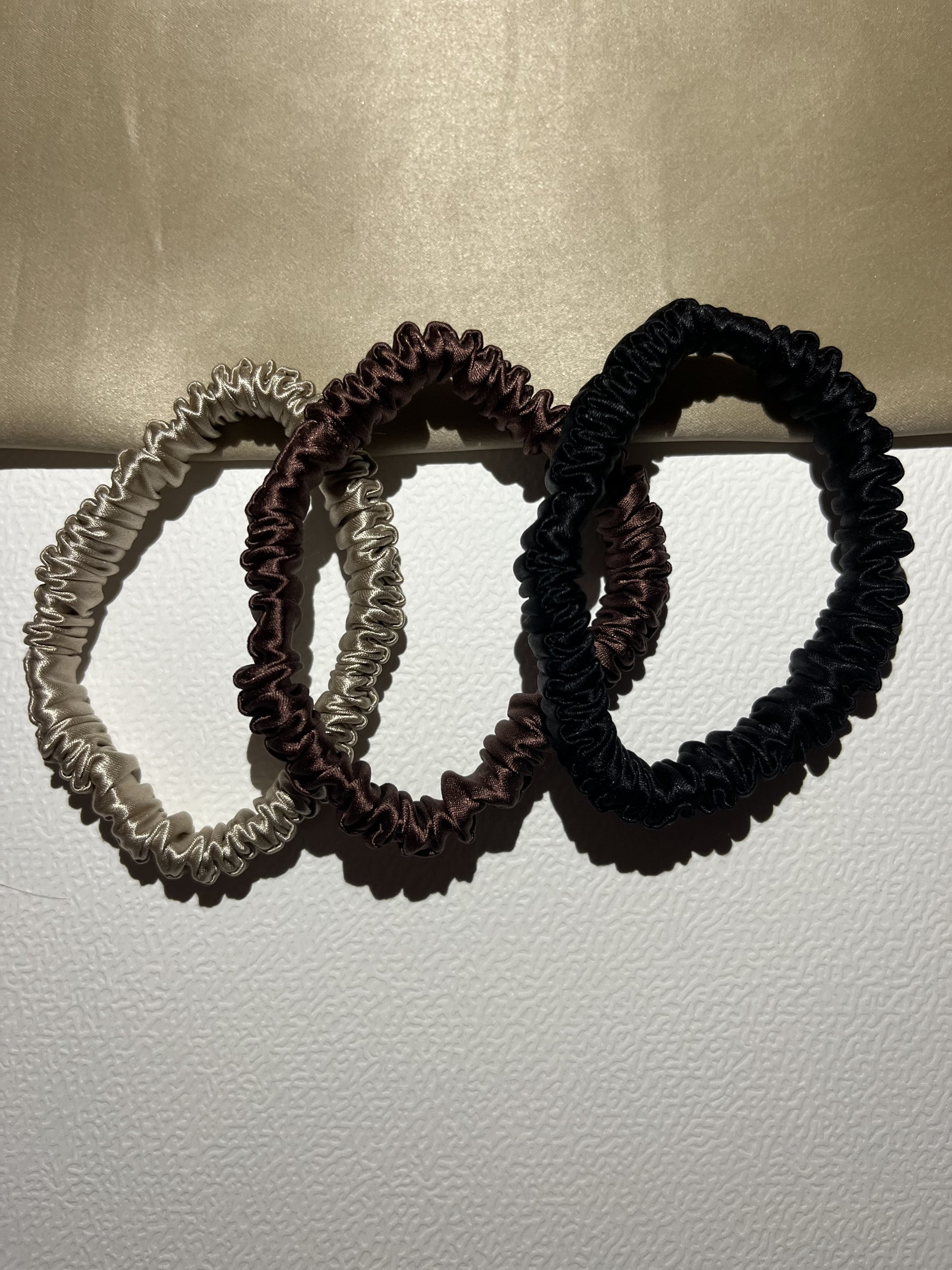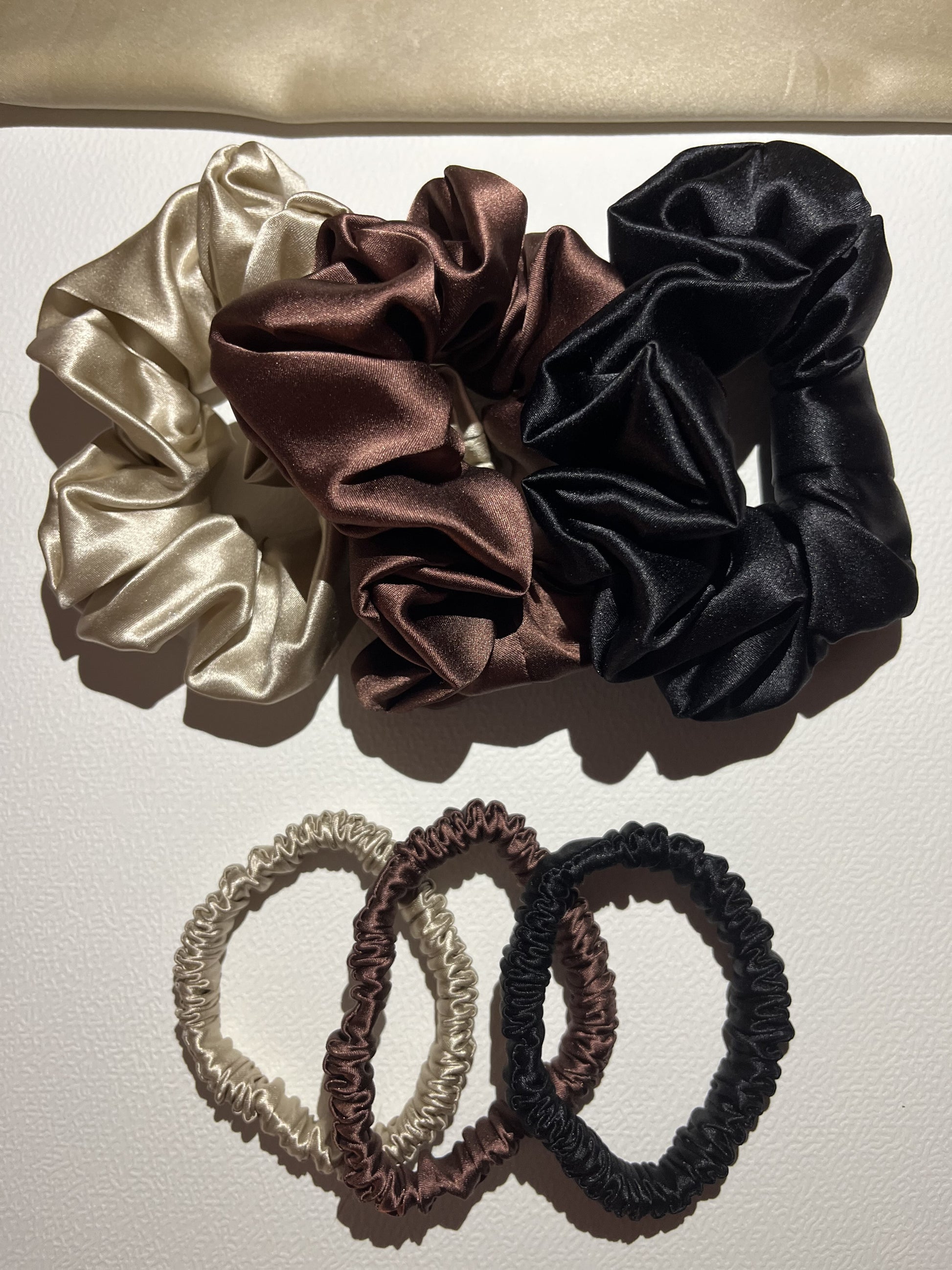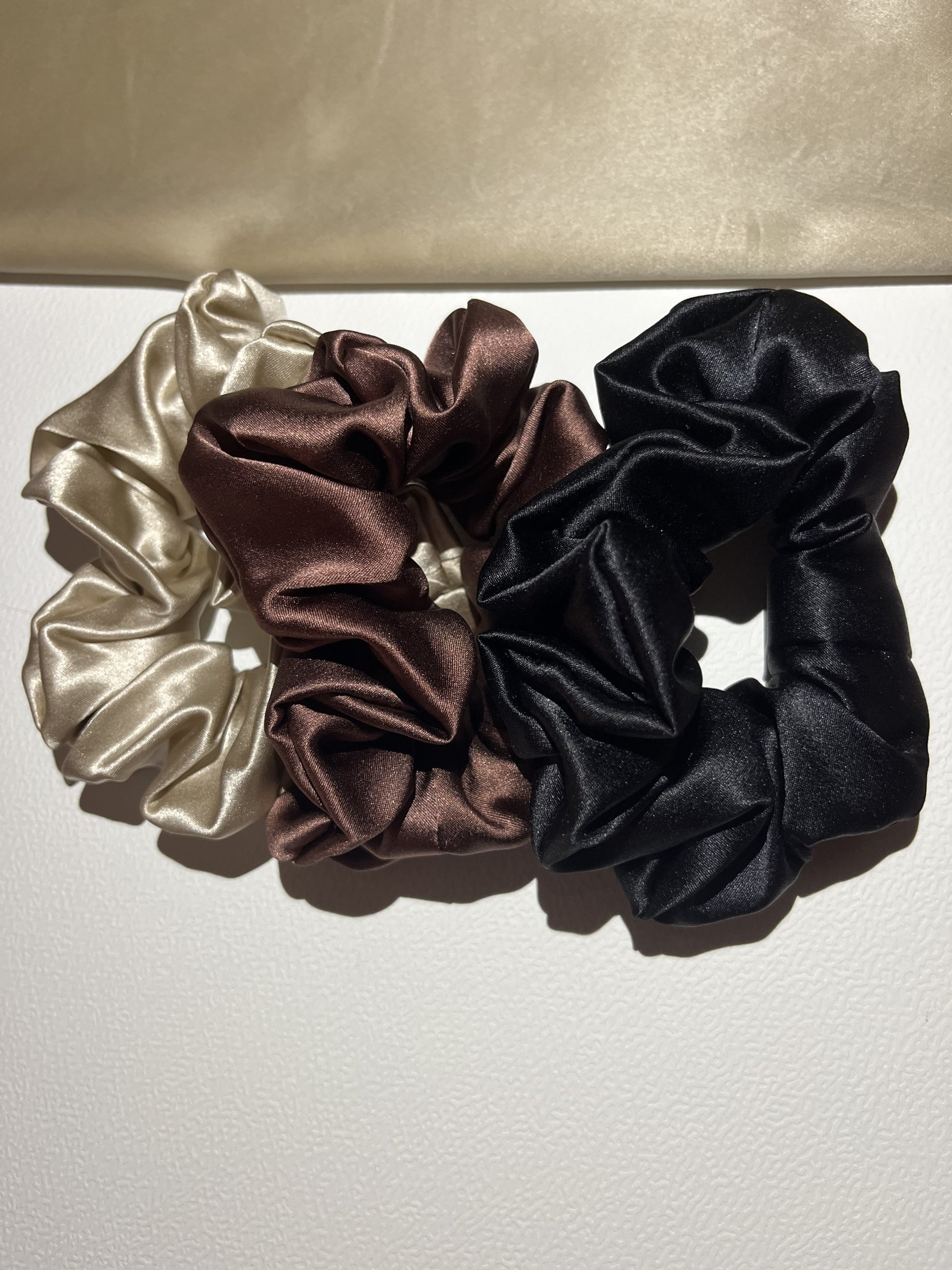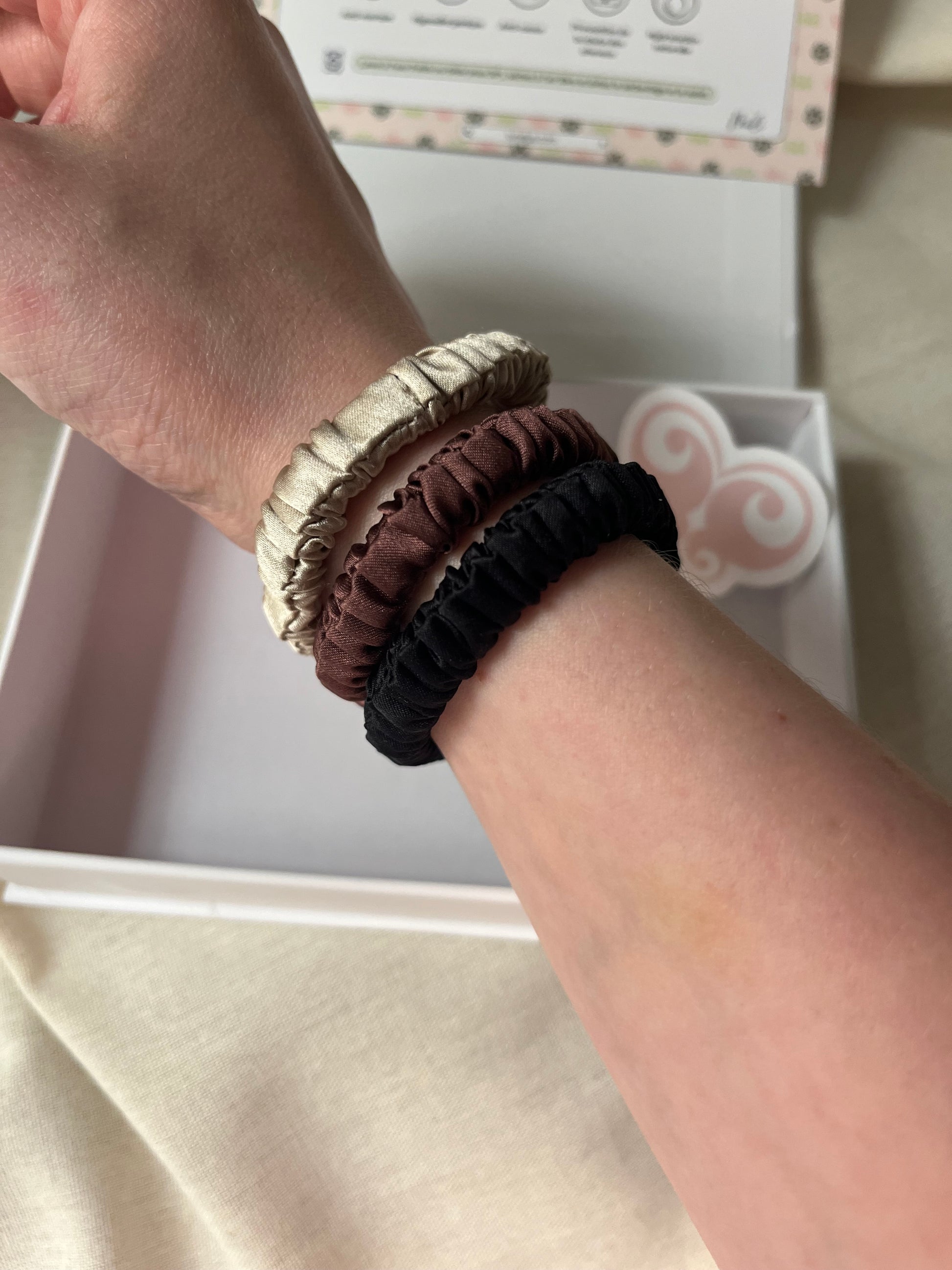 3 chouchous médiums en soie (Noir, Chocolat, Caramel) : parfaits pour un maintien confortable au quotidien.
